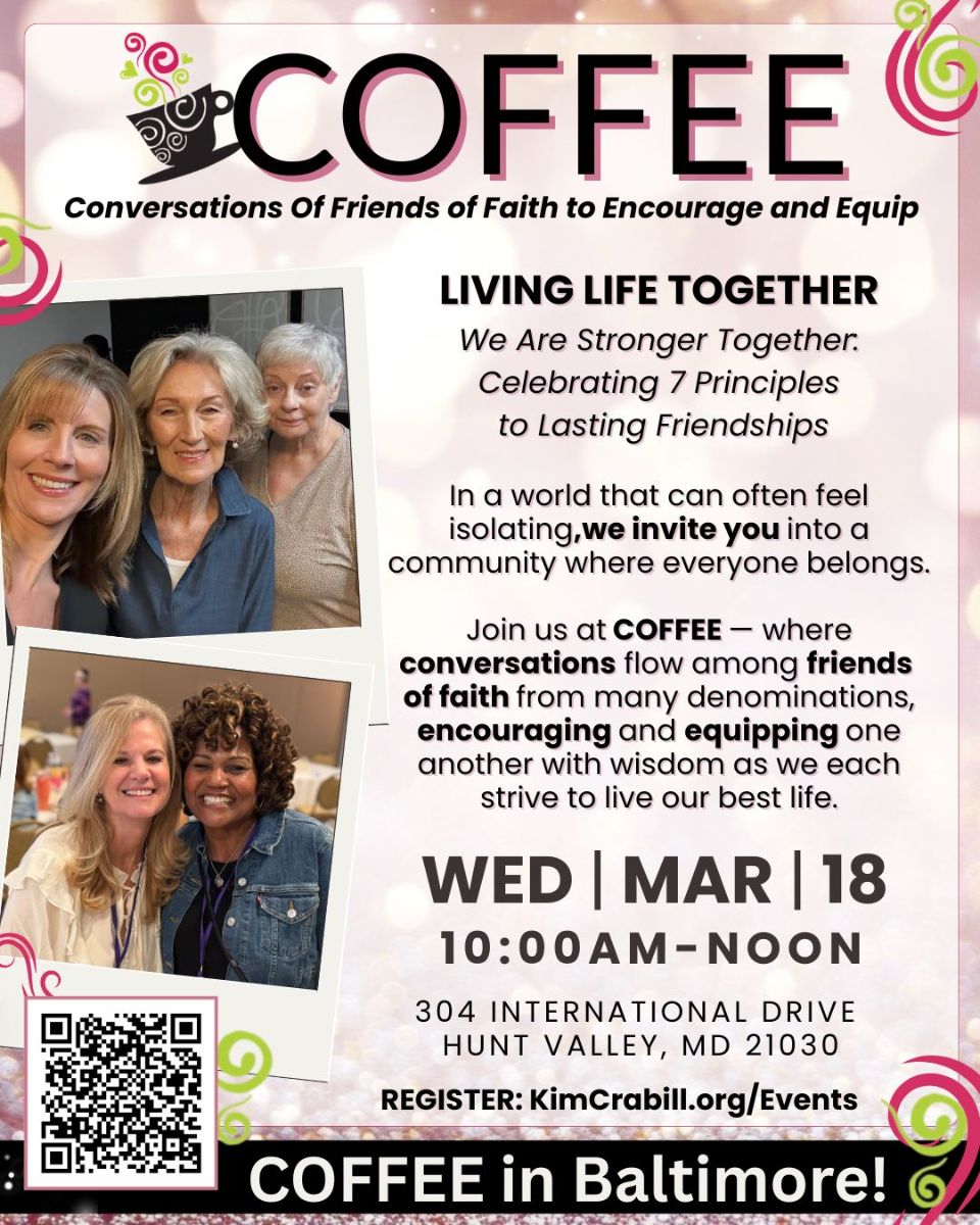 Join us for COFFEE — Conversations Of Friends of Faith to Encourage and Equip — where women from all denominations gather around the table to share wisdom, grow in faith, and strengthen one another. These meaningful conversations remind us that we’re not alone — and that together, we can live with greater purpose, hope, and joy.